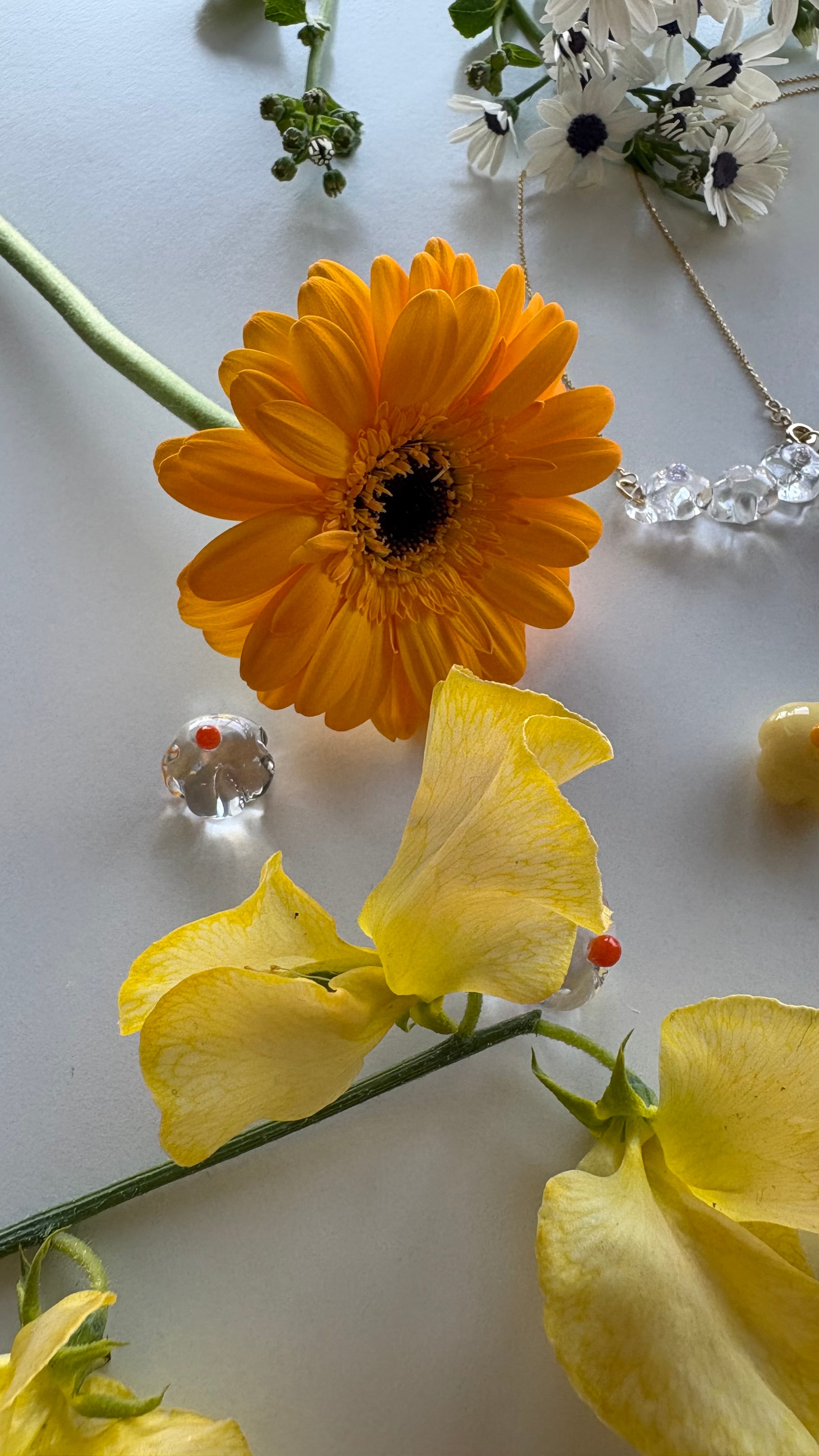 その透明感を、光を受けて表情を変えるガラスとやわらかな艶を持つ淡水パールで表現しています。