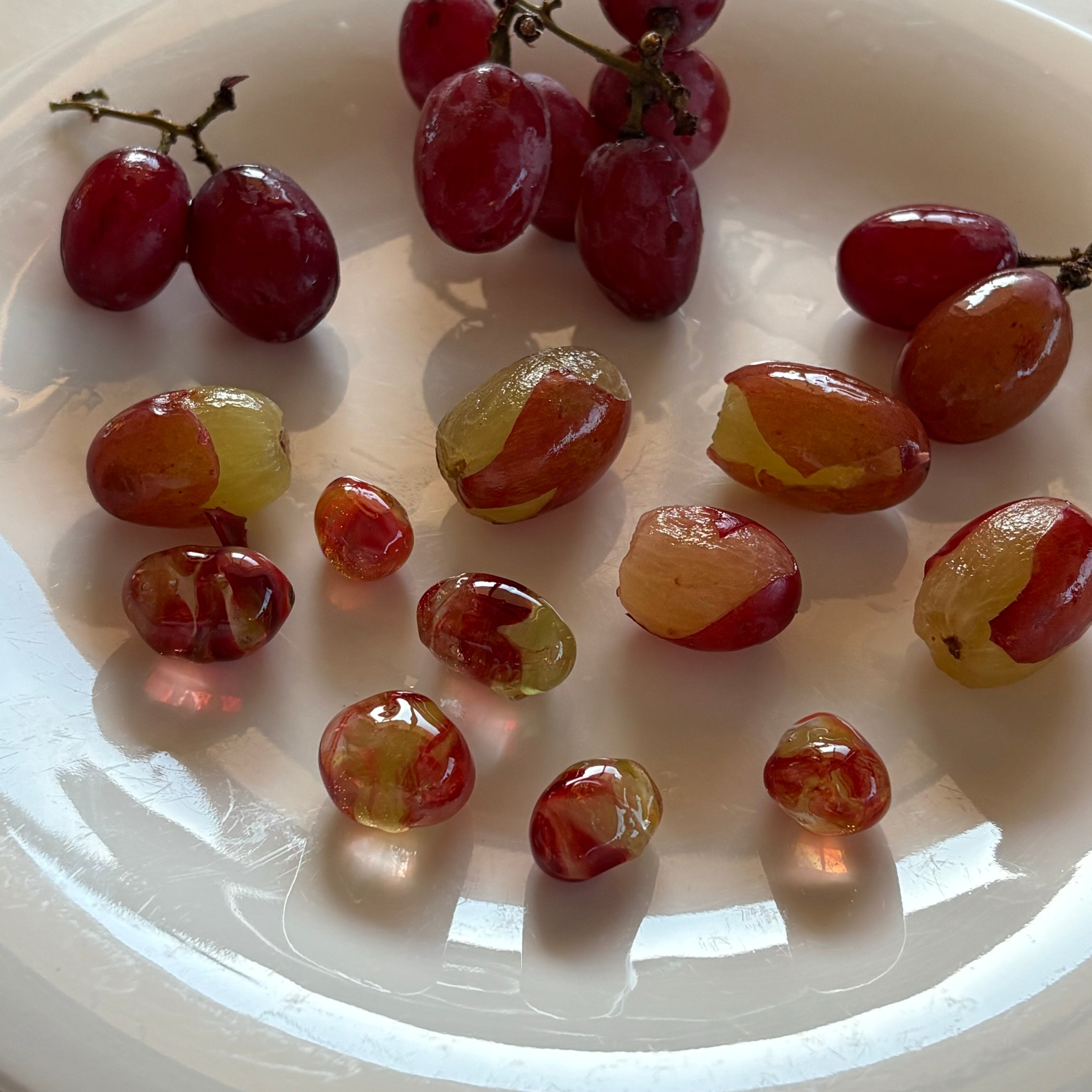 ふさから取って、少し皮をむいたときのぶどうのようになるように、色を散りばめています